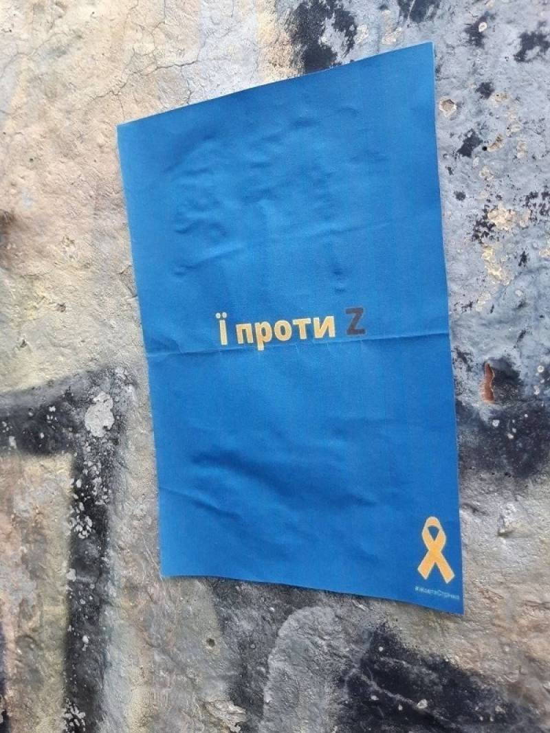 Αφίσα με τη φράση «Ї» ενάντια στο «Z» από ακτιβιστές της Yellow Ribbon από την προσωρινά κατεχόμενη πόλη Χένιτσεσκ, στην περιοχή της Χερσώνας. (Πηγή: Yellow Ribbon/Telegram). Τα ρωσικά και τα ουκρανικά χρησιμοποιούν παρόμοια κυριλλικά αλφάβητα με λίγες διαφορές. Μια διαφορά είναι το γράμμα «Ї» — που προφέρεται ως «yi» και χρησιμοποιείται στην ορθογραφία λέξεων όπως Київ (Κίεβο). Η έμφαση στο γράμμα «Ї» αντιπαρατίθεται στο «Z» που χρησιμοποιούν οι δυνάμεις κατοχής του Πούτιν.