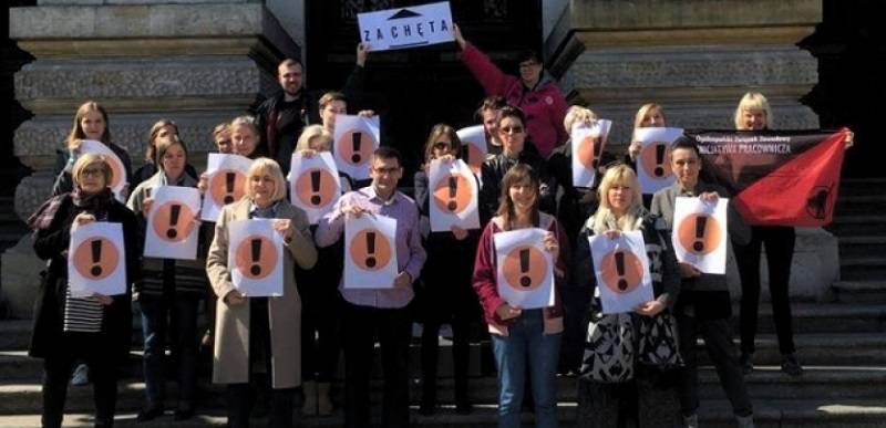 Οι εργαζόμενοι στην Εθνική Πινακοθήκη Zachęta φωτογραφίζονται στο το διάλειμμα τους στις 17 Απριλίου σε αλληλεγγύη με τους απεργούς δασκάλους. Το μαύρο θαυμαστικό σε πορτοκαλί ή κίτρινο φόντο έχει γίνει το σύμβολο της απεργίας. Φωτογραφία: Inicjatywa Pracownicza - Πρωτοβουλία Εργατών,