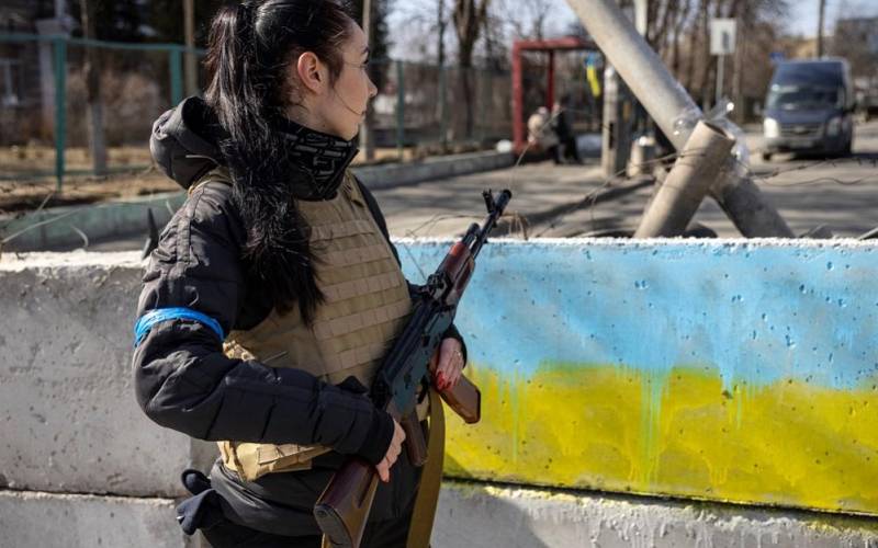 Εθελόντρια σε σημείο ελέγχου στο Κίεβο της Ουκρανίας, στις 20 Μαρτίου του 2022. (Fadel Senna/AFP/Getty Images)