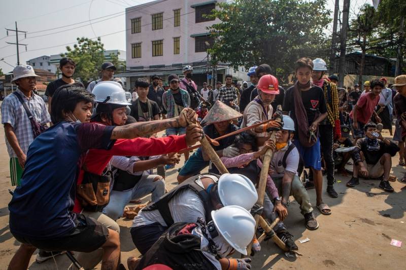 Διαδηλωτές εναντίον του καθεστώτος παίρνουν θέσεις για να αντιμετωπίσουν τα στρατεύματα του καθεστώτος στη Γιανγκόν τον Μάρτιο. The Irrawaddy