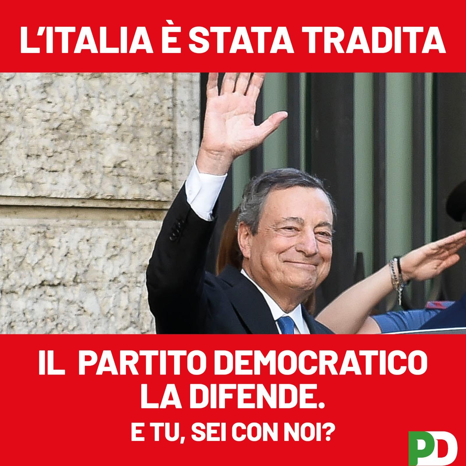 Το PD του Λέτα ήταν ο πιο ενθουσιώδης υποστηρικτής της κυβέρνησης Ντράγκι και τοποθετεί την εκστρατεία του στη συνέχεια αυτού του πλαισίου. Στην αφίσα που κυκλοφόρησε μετά την πτώση του Ντράγκι αναφέρει τα εξής: «Η Ιταλία έχει προδοθεί, Το Δημοκρατικό Κόμμα υπερασπίζεται την Ιταλία, Είσαι μαζί μας;»