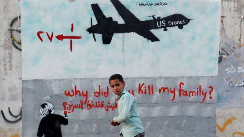 Γκράφιτι που δείχνει ένα αμερικανικό μη επανδρωμένο αεροσκάφος και από κάτω γράφει «Γιατί σκοτώσατε την οικογένειά μου», στις 13 Δεκεμβρίου 2013 στην πρωτεύουσα Σάνα’α. Μια πριν, μια επίθεση μη επανδρωμένου αεροσκάφους σε γαμήλια αυτοκινητοπομπή στην Υεμένη σκότωσε 17 ανθρώπους, κυρίως γυναίκες και παιδιά. AFP PHOTO/ MOHAMMED HUWAIS (Photo credit should read MOHAMMED HUWAIS/AFP/Getty Images)