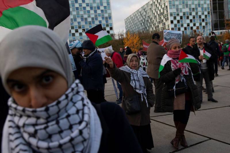 Οι διαδηλωτές συγκεντρώνονται έξω από το ΔΠΔ στις 29 Νοεμβρίου 2019 ζητώντας τη δίωξη Ιραηλινών αξιωματικών για εγκλήματα πολέμου. Φωτογραφία: Peter Dejong/AP