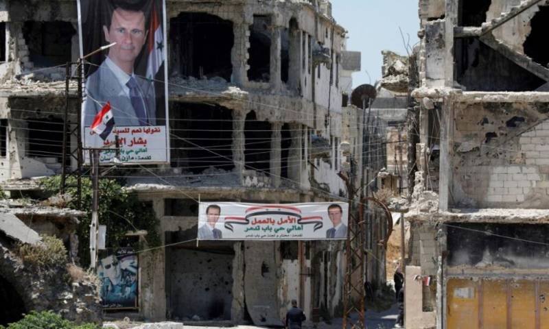Δύο πανό που ζητούσαν την εκλογή του Μπασάρ αλ Άσαντ ήταν αναρτημένα στα κατεστραμμένα κτίρια στο κέντρο της πόλης Χομς, τον Μάιο του 2021 (Reuters)