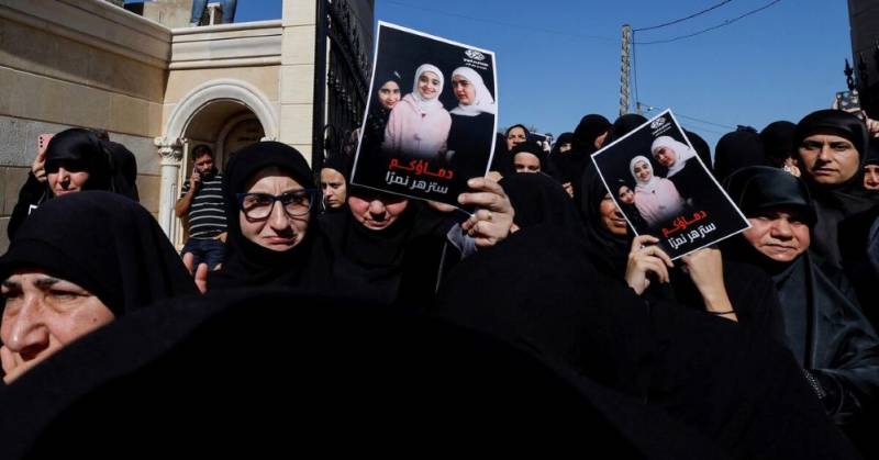 Λιβανέζες κρατάνε τις φωτογραφίες τριών κοριτσιών που δολοφονήθηκαν από τους Ισραηλινούς κατά τη διάρκεια αεροπορικής επίθεσης τον Νοέμβριο του 2023. REUTERS/Zohra Bensemra Purchase Licensing Rights