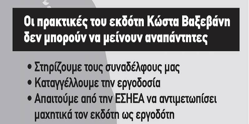 Καλούμε την ΕΣΗΕΑ να υπερασπιστεί επιτέλους τα μέλη της και τη δημοσιογραφική δεοντολογία, να προκηρύξει απεργια και να αντιταχθεί στην εργοδοτική τρομοκρατία και τις αισχρές τακτικές δολοφονίας χαρακτήρα, που δημιουργούν προηγούμενο και στους άλλους εργοδότες να ακολουθήσουν ανάλογες μεθόδους.