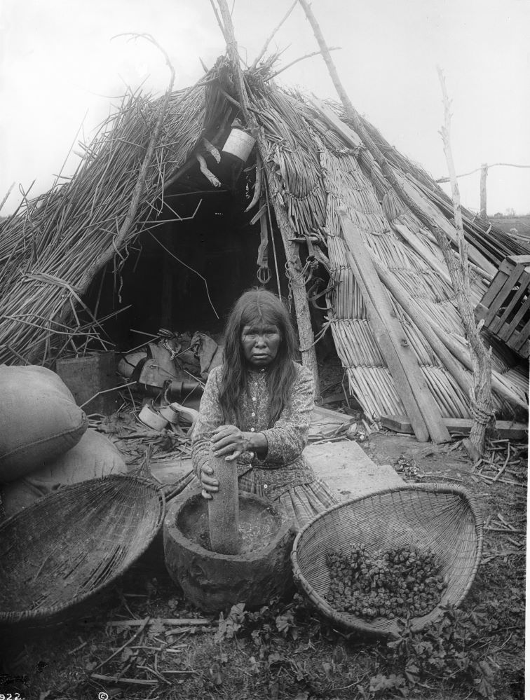 Ινδιάνα Παϊγιούτ αλέθει βελανίδια για αλεύρι, Lemoore, Kings County, περίπου 1900