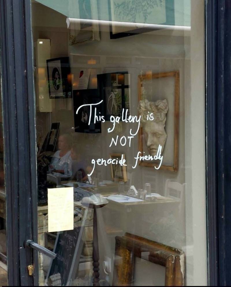Αυτό που στοχοποίησε τη γκαλερί ήταν η επιγραφή στη βιτρίνα: The gallery is not genocide friendly (αυτή η γκαλερί δεν είναι φιλική προς τη γενοκτονία).