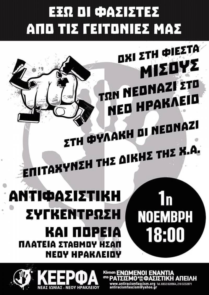 Καλούμε τα συνδικάτα, τους συλλόγους, τις κοινότητες μεταναστών, τις δημοτικές κινήσεις, τις συλλογικότητες να δώσουν παρών στην αντιφασιστική κινητοποίηση στη 1 Νοέμβρη, 6.00 μμ, στη ΠΛΑΤΕΙΑ ΗΣΑΠ ΗΡΑΚΛΕΙΟΥ.