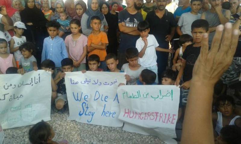 Μικρά παιδιά κρατούν αυτοσχέδια πλακάτ που γράφουν στα αγγλικά «πεθαίνουμε με το να μένουμε εδώ», «είμαι άνθρωπος και έχω το δικαίωμα να ζήσω μια αξιοπρεπή ζωή», και «απεργία πείνας».