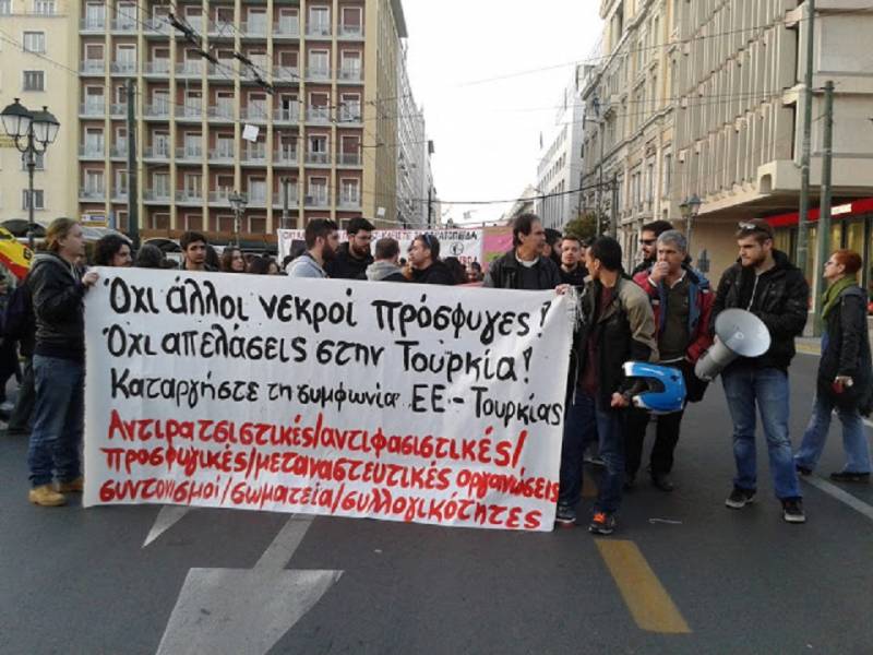 Διαβάστηκε το κοινό κείμενο καλέσματος των οργανώσεων, φωνάχτηκαν συνθήματα και στη συνέχεια έγινε πορεία στη Βουλή. Στην κεφαλή της πορείας τέθηκε το κοινό πανό αντιρατσιστικών/αντιφασιστικών/προσφυγικών/μεταναστευτικών οργανώσεων, συντονισμών, σωματείων, συλλογικοτήτων με το σύνθημα «Όχι άλλοι νεκροί πρόσφυγες. Όχι απελάσεις στην Τουρκία. Καταργήστε τη συμφωνία Ε.Ε.-Τουρκίας». Στη συνέχεια ήταν πανό με πρόσφυγες του χώρου διαμονής City Plaza, το πανό του Συντονισμού για το Προσφυγικό-Μεταναστευτικό, της ΚΕΕΡΦΑ, του Κυριακάτικου σχολείου Μεταναστών, της Κίνησης Απελάστε το Ρατσισμό και αρκετών ακόμα μαζικών και πολιτικών οργανώσεων.