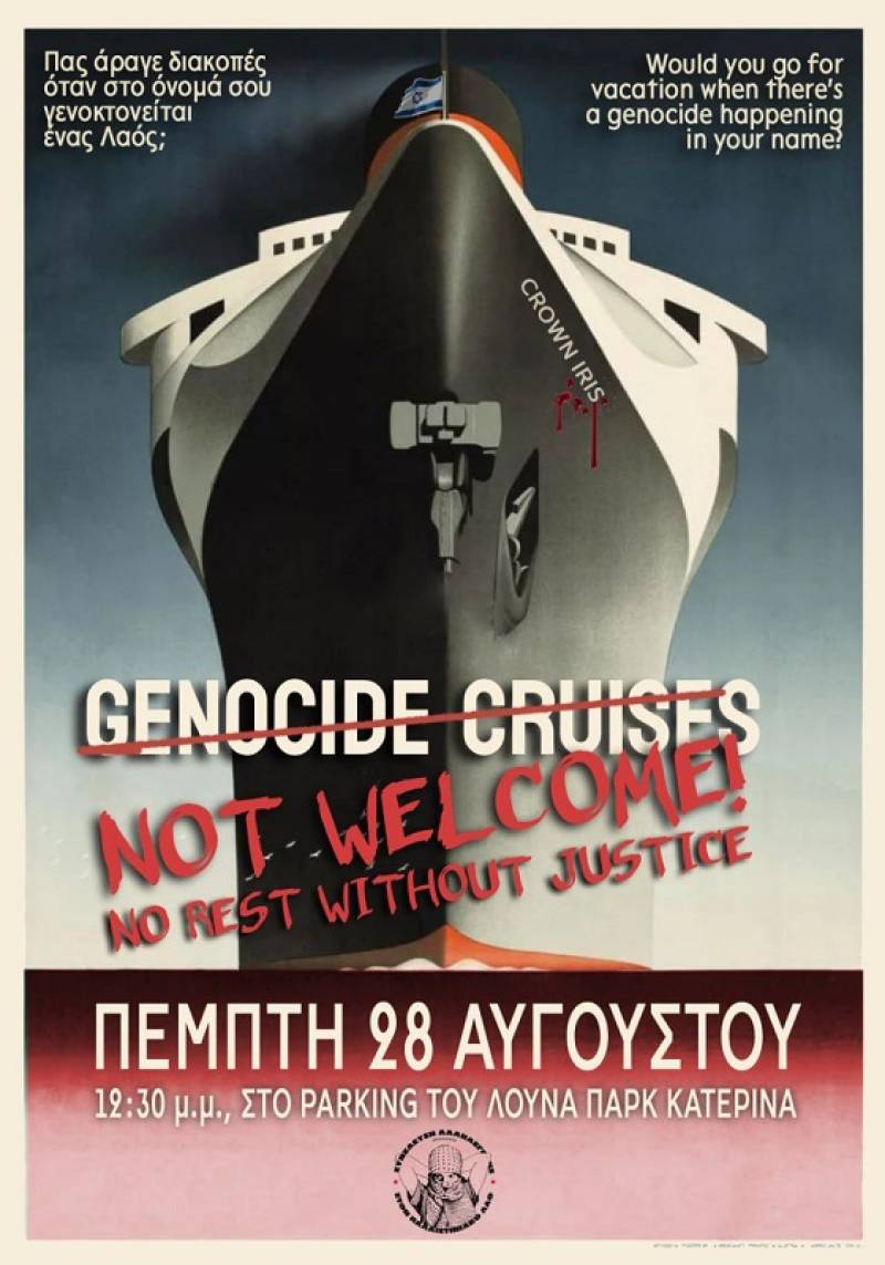 Εσπευσμένα, την Πέμπτη 28 Αυγούστου, στις 13.00 το γνωστό κρουαζιερόπλοιο, με επιβαίνοντες περίπου 1600 Ισραηλινούς, όπως έχει πλέον αποδειχθεί, ως επί το πλείστον υποστηρικτές της ολικής ισοπέδωσης της Γάζας και του αφανισμού των Παλαιστινίων, έχει κανονιστεί να ελλιμενιστεί στην πόλη μας.