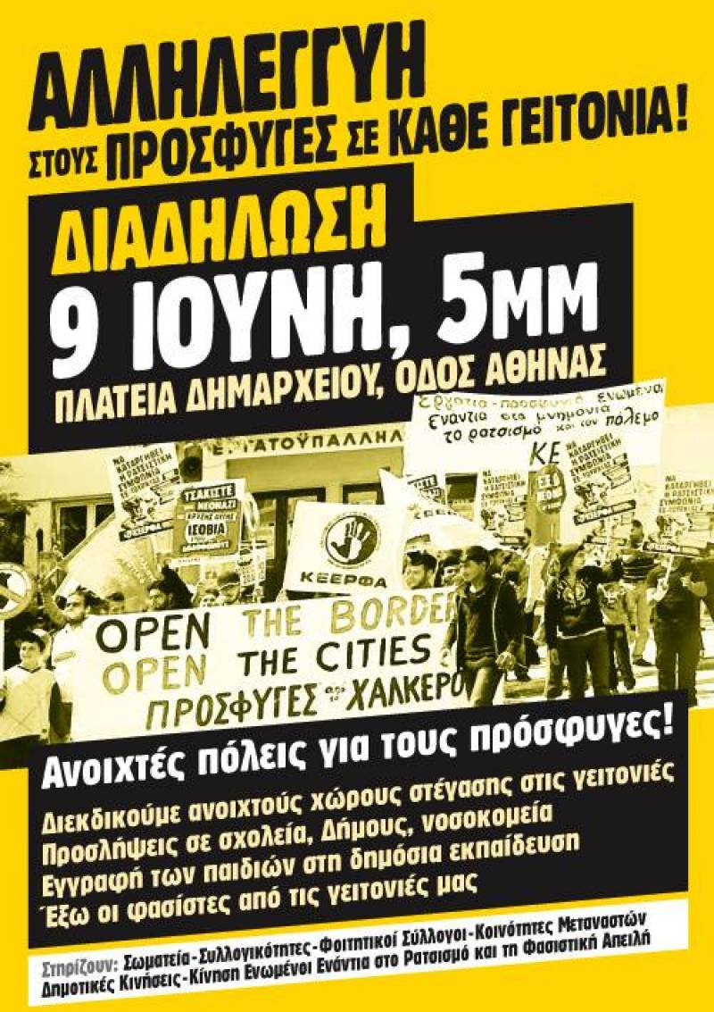 O Συντονισμός για το Προσφυγικό-Μεταναστευτικό καλεί σε συγκέντρωση την Πέμπτη 9/6 στις 5μμ στο Δημαρχείο της Αθήνας, την ώρα που θα συζητηθεί το προσφυγικό ζήτημα στο δημοτικό συμβούλιο, για να στηρίξουμε το αίτημα για