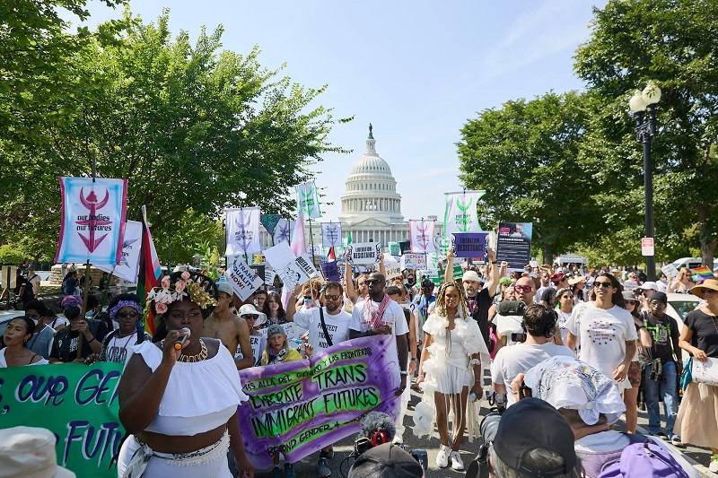 Πέρυσι, καθώς οι αντι-τρανς επιθέσεις άρχισαν να επιτείνονται, αρχίσαμε να οργανώνουμε μαζί την Πορεία Απελευθέρωσης των Φύλων, η οποία έγινε τον περασμένο Σεπτέμβριο. Στόχος μας ήταν να διευρύνουμε τις συζητήσεις που διεξάγουν τα κινήματά μας και να κάνουμε τον κόσμο να καταλάβει πώς τα ζητήματα και οι αγώνες μας συνδέονται μεταξύ τους. Είχαμε αρκετούς ομιλητές, για παράδειγμα, που εργάζονται για την πρόσβαση στην άμβλωση, τον τρανς και μη δυαδικό ακτιβισμό, αφηγήτριες εμπειριών για την άμβλωση, οικογένειες νέων τρανς ατόμων και ούτω καθεξής. Αλλά, είχαμε επίσης άτομα που μίλησαν για την κλιματική δικαιοσύνη, την οικονομική ανισότητα και τον αγώνα για την απελευθέρωση της Παλαιστίνης και την αποικιοκρατία, και κάναμε συνδέσεις για το πώς αυτοί οι αγώνες εντάσσονται στο πλαίσιο της απελευθέρωσης των φύλων. Και ήταν στη διαδικασία σχεδιασμού για την πορεία απελευθέρωσης των φύλων στην Ουάσιγκτον που συνειδητοποιήσαμε ότι γινόμασταν οργάνωση. Δεν ήταν απαραίτητα κάτι που είχαμε σχεδιάσει, αλλά είδαμε τους εαυτούς μας να δημιουργούμε έναν πολύ μοναδικό χώρο για να συναντηθούν τα κινήματά μας.