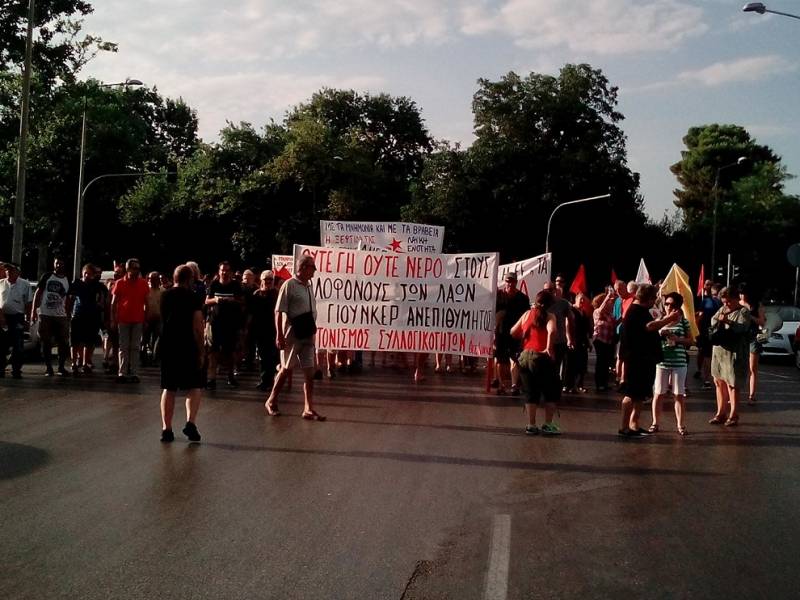 Καταγγέλλει την κυβέρνηση ΣΥΡΙΖΑ-ΑΝΕΛ η οποία για το χατίρι του επικεφαλής της Ευρωπαϊκής Επιτροπής και της ΕΕ μετέτρεψε τη Θεσσαλονίκη σε πολιορκημένη πόλη από χιλιάδες πάνοπλους αστυνομικούς, ΜΑΤ, κλούβες κλπ. Η κυβέρνηση ουσιαστικά απαγόρευσε την πορεία που ξεκίνησε από το Λ. Πύργο μετά από κάλεσμα του Συντονισμού Συλλογικοτήτων Θεσσαλονίκης, της ΑΝΤΑΡΣΥΑ και άλλων πολιτικών οργανώσεων της πόλης, καθώς μόλις διέσχισε λιγότερο από 300 μέτρα βρέθηκε αντιμέτωπη με κλούβες που έκλειναν τους δρόμους και την καταστολή της αστυνομίας. Είναι σαφές ότι η αστυνομία είχε κυβερνητική εντολή να μη γίνει η πορεία και γι’ αυτό έκλεισε όλους τους δρόμους 5 χιλιόμετρα μακριά από το Μέγαρο Μουσικής που θα γινόταν η φιέστα για τον Γιούνκερ. Η αστυνομία επιτέθηκε με βία και χημικά επανειλημμένα, ενώ προσπάθησε να μπει μέσα στην πορεία προκειμένου αυτή να μη φτάσει στην ΕΡΤ 3.