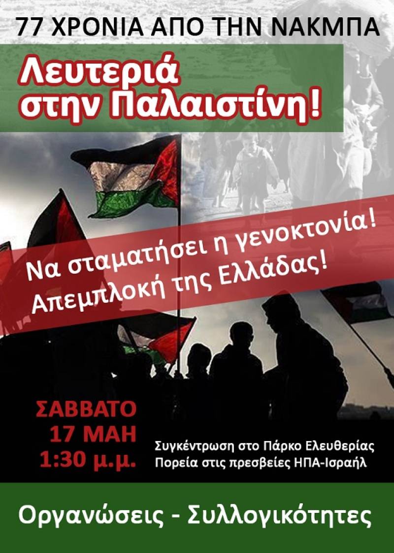 Η ΑΝΤΑΡΣΥΑ καλεί στην κινητοποίηση που γίνεται στην Αθήνα στις 17 Μάη, στις 1.30 μ.μ., στην πλατεία Ελευθερίας (Μέγαρο Μουσικής). Στην κινητοποίηση καλούν Παλαιστινιακές οργανώσεις, σωματεία, σύλλογοι, συλλογικότητες, πολιτικές οργανώσεις. Θα ακολουθήσει πορεία στην αμερικανική και στην ισραηλινή πρεσβεία.
