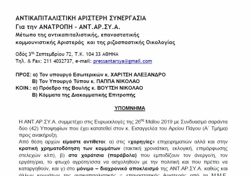 Η ΑΝΤ.ΑΡ.ΣΥ.Α. συμμετέχει στις Ευρωεκλογές της 26ης Μαΐου 2019 με Συνδυασμό σαράντα δύο (42) Υποψηφίων που έχει κατατεθεί στον κ. Εισαγγελέα του Αρείου Πάγου (Α΄ Τμήμα) προς ανακήρυξη.