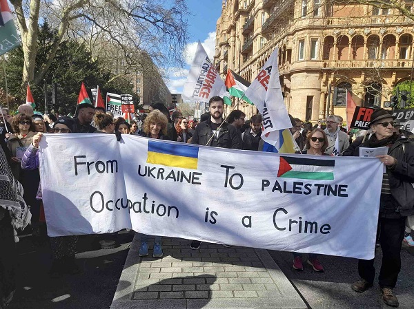 Το Σαββατοκύριακο του Πάσχα, στην τελευταία γιγαντιαία πορεία στο Λονδίνο ενάντια στην βρετανική συνενοχή στον πόλεμο του Ισραήλ κατά της Γάζας, μια ομάδα από εμάς πήρε ένα πανό που έγραφε "Από την Ουκρανία στην Παλαιστίνη, η κατοχή είναι έγκλημα". Οι διαδηλωτές γύρω μας καλωσόρισαν και ο κόσμος υιοθέτησε το σύνθημά μας.